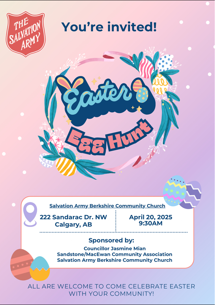 Where: Salvation Army Berkshire community Church – 222 Sandarac Drive S.W.